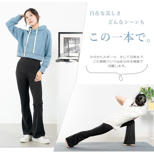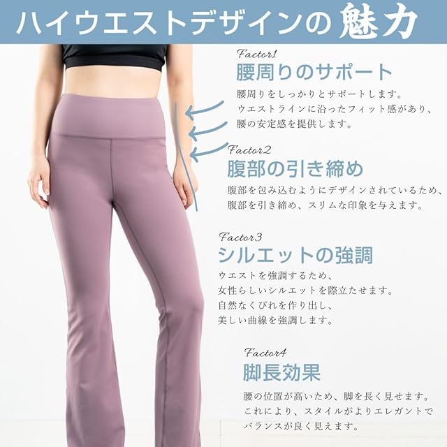 【ハイウエスト】このハイウエストフレアパンツは、腰周りをより安定的に包み、サポートできます。3D裁断で、よりデザイン感的で魅力的でスタイリッシュな外観になっています。お腹を締め付けないよう幅広のウエストバンド採用で長時間の着用でも窮屈感がなく快適です。