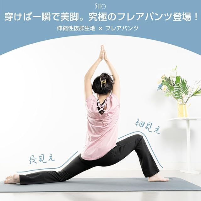 【フレアレギンス】膝から緩やかに広がるフレアカットのスラッとしたシルエットでスタイルを美しく見せます。誰でも美しく着こなすことができるヨガパンツです。しなやかで伸縮性に優れ軽量なので様々なポーズや動きにも対応できます。