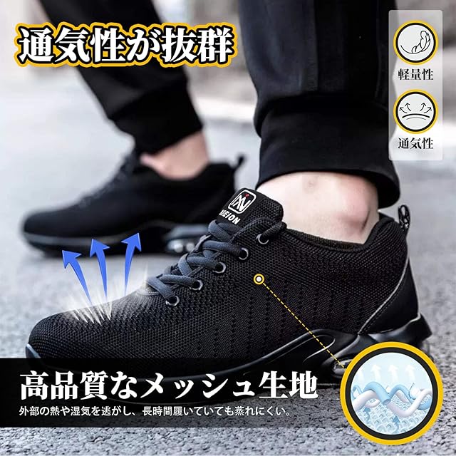 [nieion] 安全靴 作業靴 メンズ レディース エアクッション 安全スニ一カ一 鋼先芯 釘踏み抜き防止 軽量 耐滑 耐摩耗 衝撃吸収 工事現場 ワークシューズ セーフティーシューズ あんぜん靴 (ブラック 25.5cm)