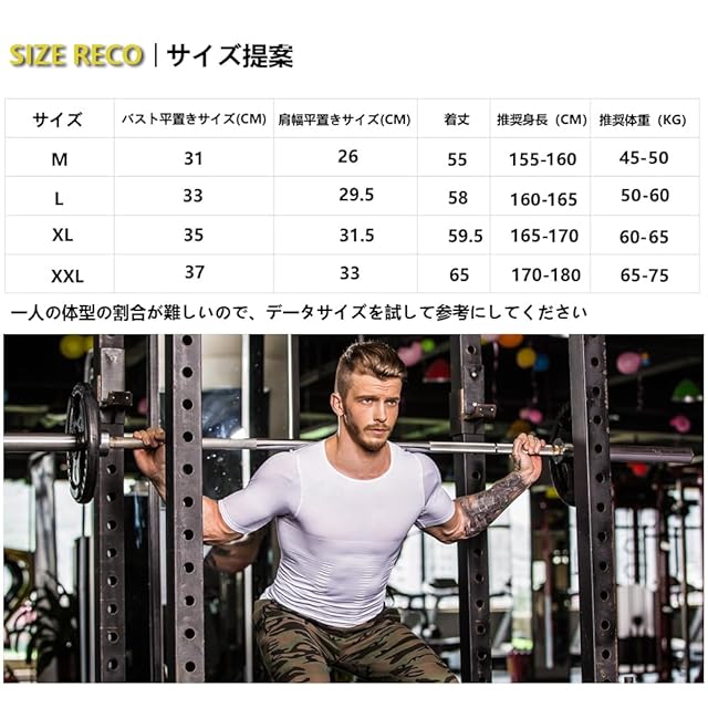 【着用サイズ】:加圧インナー 半袖 (M:身長約 155cm-160cm、体重約45kg-50kg) (L :身長約 160cm-165cm、体重約50kg-60kg) (XL:身長約 165cm-170cm、体重約60kg-65kg) (2XL:身長約 170cm-180cm、体重約65kg-75kg)※【2枚組】コンプレッション Tシャツ ,圧力のある着心地が苦手なお客様は、サイズ表に適したサイズもしくはワンランク上をお求めください。ぶ注意:ナイロン素材で、1-2c m誤差を予めご了承下さい。