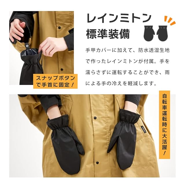 耐水圧10,000mm、透湿度5,000gと軽量で薄手の防水透湿生地を採用し、しっかりと雨を防ぎつつ内部の蒸れを外に逃がして蒸れを軽減してくれます。雨の日の自転車はもちろんアウトドアやレジャー、スポーツ観戦や屋外イベントなど幅広く着用頂けます。