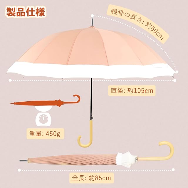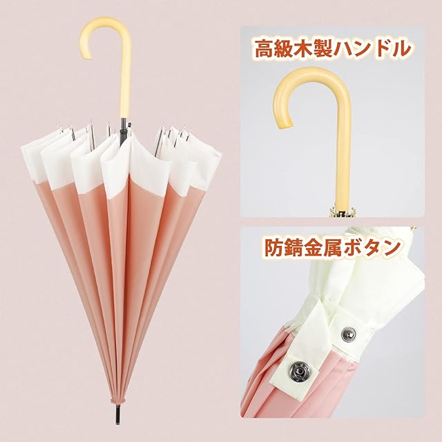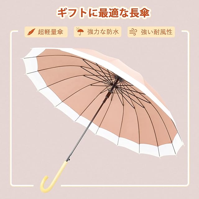 【耐久性に優れ、曲線が美しい16本骨傘】その美しい16本の骨は柔軟で丈夫なグラスファイバーを採用し従来の8本骨の2倍の16本骨にすることで今までにない強度と耐久性を実現。強風にあおられても、安易に折れたり曲がったりする心配ありません。雨と風が同時に襲ってきやすい日本だからこそ、丈夫で折れにくい傘は魅力です。風をうまく受け流しながら、悪天候に負けずに使用できます。また、16本骨傘は8本骨傘に比べて円形に近い形状になるので見た目も美しく、男女問わず使用できる傘です。