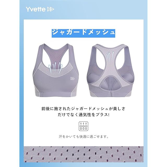 Yvette(イベット) スポーツブラ 揺れない レディース ハイサポートパッド 後ろホック付き ノンワイヤー メッシュ切り替え フィットネスブラ ブルーラベンダー S