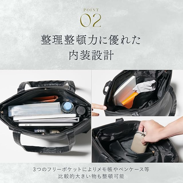 【収納力】A4サイズの書類やファイルが縦向きでも横向きでも収納できる大きさで、荷物が多いときでもスタイリッシュなデザインを損ないません。バッグの中で折れ曲がったりシワになったりしてしまいがちな、大きめサイズの書類がすっぽり収まります。