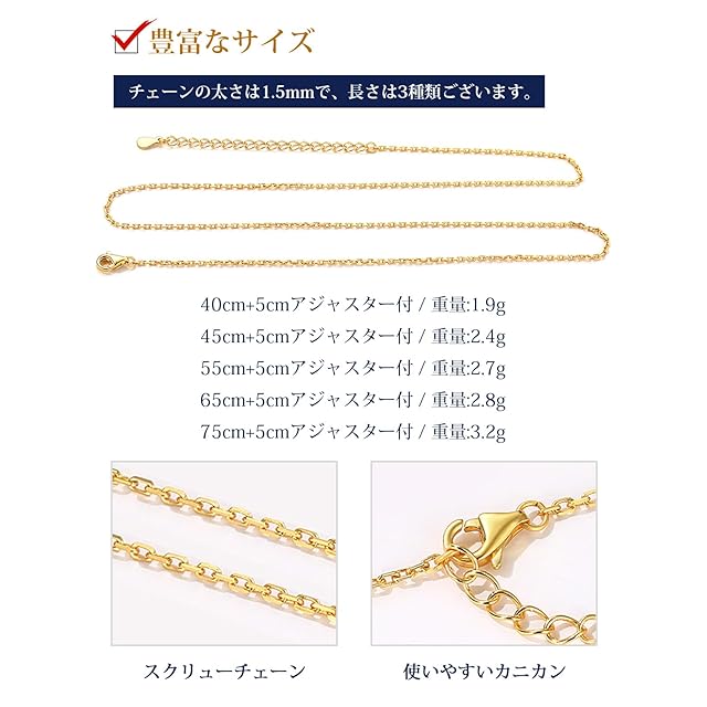 [Suplight] ネックレス チェーンのみ ゴールド 18金 あずきチェーン レディース 人気 細め アレルギー 幅1.5mm 長さ40cm+5cmアジャスター