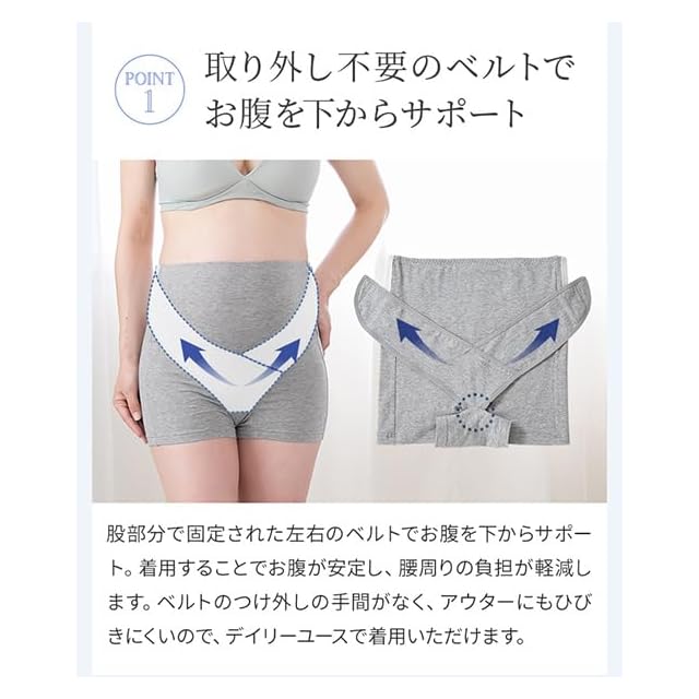 【オーガニック素材をつかったやさしい肌触り】サポートベルトの裏側のみパワーネットを使用し、適度なサポート力で快適さを重視したベルト調整付きのパンツ妊婦帯です。お腹が安定し腰への負担も軽減。オーガニックコットンを使用したベア天竺素材で、1枚履きもできるやさしい肌触りに仕上げました。