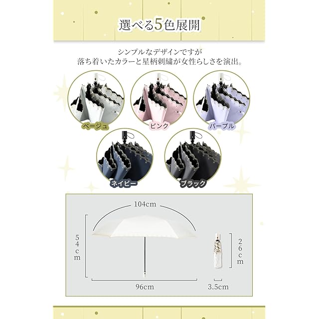 「おしゃれなデザイン」シンプルなデザインですが、落ち着いたカラーと星柄刺繍が女性らしさを演出。母の日、誕生日、記念日、クリスマス、ホワイトデーの贈り物としてもおすすめです。通勤、通学、スポーツ観戦、夏フェス、イベント、キャンプ、遠足、アウトドア、旅行など用の折りたたみ日傘は、便利な持ち運びに便利なアイテムです。