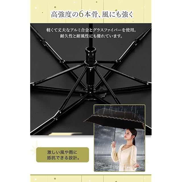 「高強度の6本骨&耐風」軽くて丈夫なアルミ合金とグラスファイバーを使用する傘骨が6本あるので、優れた耐風性を持っています。強い風にあおられても折れたり曲がったりしにくいし、万が一逆さに反しても傘を閉じる動作で簡単に元戻ります。豪雨、強風など不安定な天気の日でもでも安心できます。