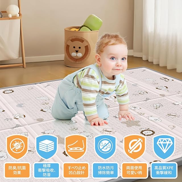 「厚手で衝撃吸収・防音」:厚さ1cmのプレイマットは衝撃吸収性に優れ、プレイマットをする赤ちゃんや小さな子どもにとっては、転倒時の保護にもなり、走ったりジャンプしても、マットが衝撃を吸収。周囲や階下への防音対策にびったり!