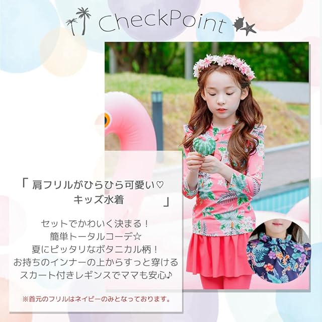 セット内容・2点セット ・水着(ラッシュガード+スカート付きレギンス) 肩周りのフリルがガーリーで女の子可愛い♪ ジュニア 小学生 子供用水着 日焼け対策 かわいい
