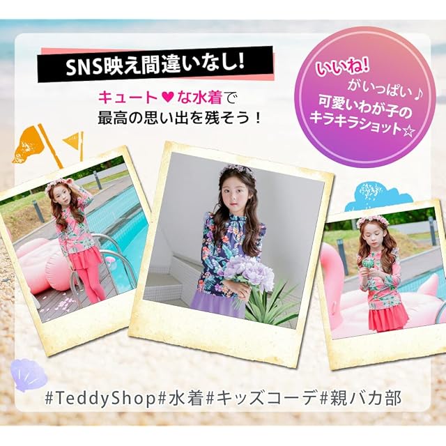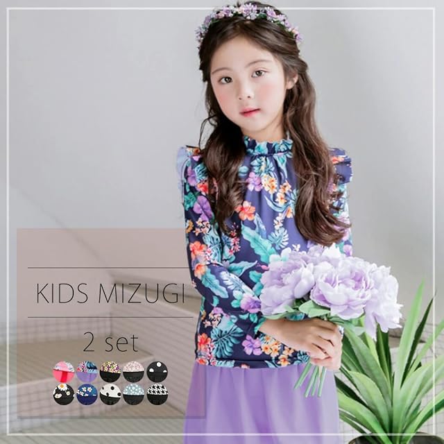 [Teddy] 水着 キッズ 女の子 セパレート 長袖ラッシュガード スカート付きレギンス 上下セット kids421 (90cm, パープル×フラワー)