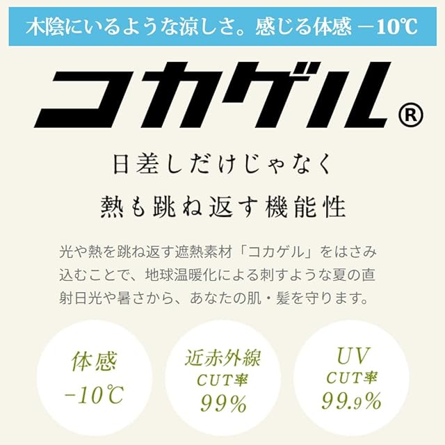 紫外線遮蔽率(UVカット):99.9%以上、近赤外線遮蔽率:99.2%、遮熱率:65%以上、体感温度:-10℃以上