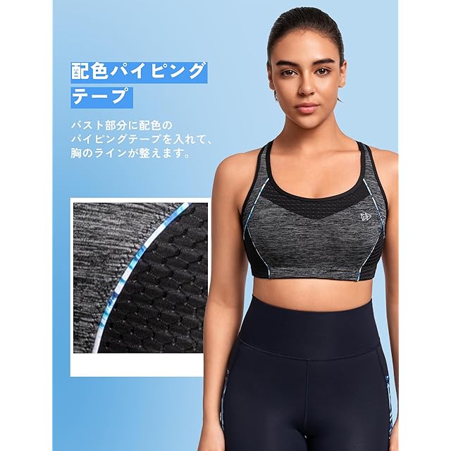 ランニング——ハイインパクト、4WAYストレッチ素材を使い、ホールド力が高くぴったりとフィット。胸が大きい方にランニングの時も揺れを防いで、胸筋辺りが痛くない