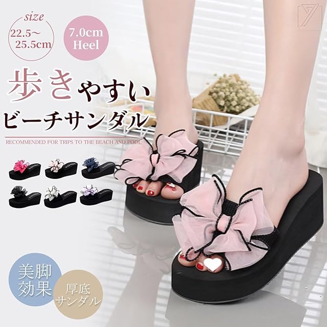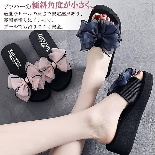 【デザイン】リボンのデザインが甘くて可愛い。7cmのウェッジソールは、身長を伸ばすことができる。厚底設計にもかかわらず、靴全体が超軽量なので、長時間歩いても足が疲れる心配がありません。厚底ソールで美脚脚長効果を実現、履きやすく歩きやすい万能サンダルです。どんな服装にも合わせやすいスリッパ。