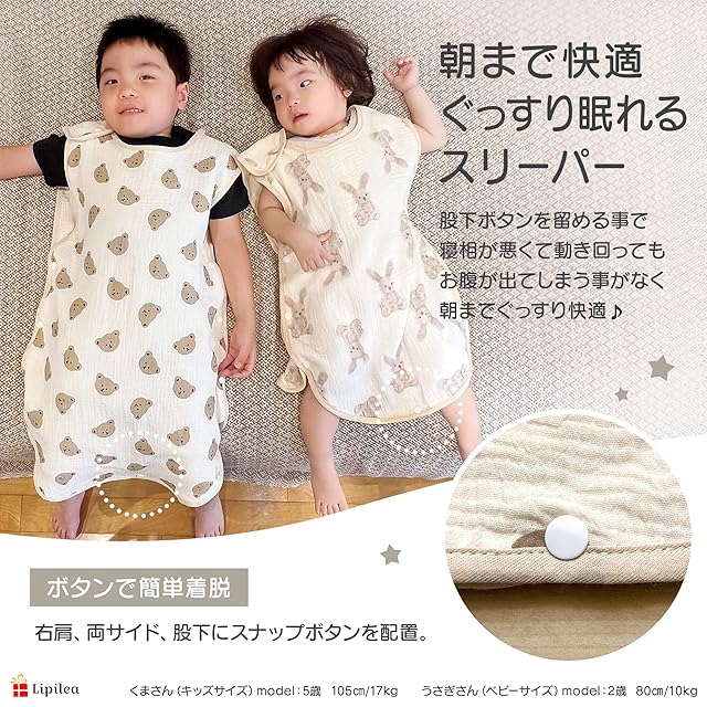 【洗う度に風合いが増すふわっとやわらかガーゼ】 敏感肌のお子様も安心◎毎日着たくなる、柔らかく肌触りの良い綿100%素材を使用しています。生地は伸縮加工で、凸凹部分にたっぷり空気を含むと、ふわふわの触りに♪また、4重ガーゼ採用したことで、薄すぎたり厚すぎたりせずちょうど良い厚みで、お子様の着心地も抜群です。オールシーズン活躍してくれるスリーパーは、季節に合わせて買い足さなくてもOK!経済的なところもうれしいポイントです。