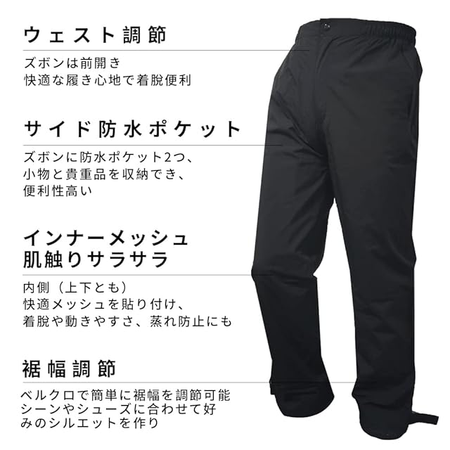 【上下セットで経済的、人体工学】上下セットのため上下でのデザインが統一でき、またトップス、ボトムスを個別で購入するよりも経済的です。ズボンを3cm長くした、サイクリングをより便利になります。裾に付けられたボタンで裾幅やズボ長さを調整でき、雨や風の浸入を効果的に防ぎます。パンツのウェストに付けられたドローコードで自分好みのサイズ調節可能、最適なフィット感を実現する。