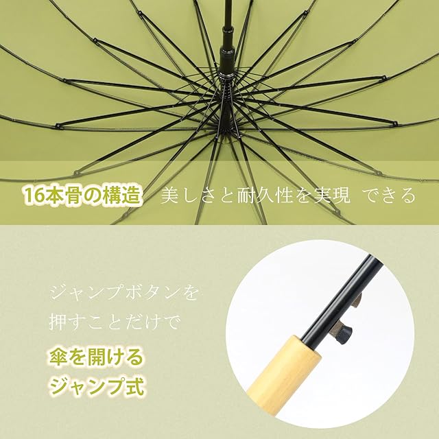 【耐久性に優れ、曲線が美しい16本骨傘】その美しい16本の骨は柔軟で丈夫なグラスファイバーを採用し従来の8本骨の2倍の16本骨にすることで今までにない強度と耐久性を実現。強風にあおられても、安易に折れたり曲がったりする心配ありません。雨と風が同時に襲ってきやすい日本だからこそ、丈夫で折れにくい傘は魅力です。風をうまく受け流しながら、悪天候に負けずに使用できます。また、16本骨傘は8本骨傘に比べて円形に近い形状になるので見た目も美しく、男女問わず使用できる傘です。