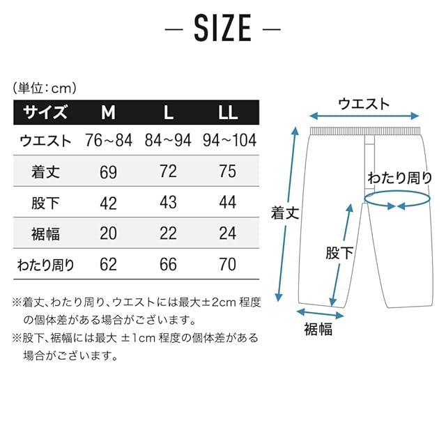 【ウエストサイズ】M/76~84cm、L/84~94cm、LL/94~104cm、3L/98〜108cm、4L/104〜114cm、5L/110〜120cm