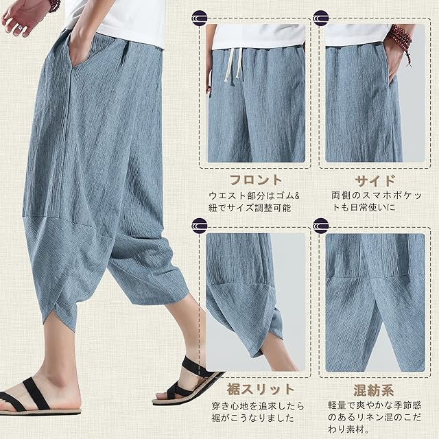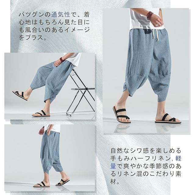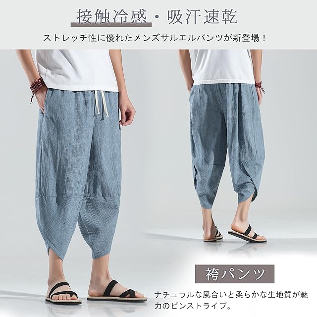 【1】接触冷感・吸汗速乾・ストレッチ性に優れたメンズサルエルパンツが新登場!軽量で爽やかな季節感のあるリネン混のこだわり素材。綿麻特有の通気性で、夏でも快適にサラッと肌あたりがよく涼しげなリネンと、フィットし過ぎないシルエットとサラッとした接触冷感素材の効果で暑い日でも快適な穿き心地です。