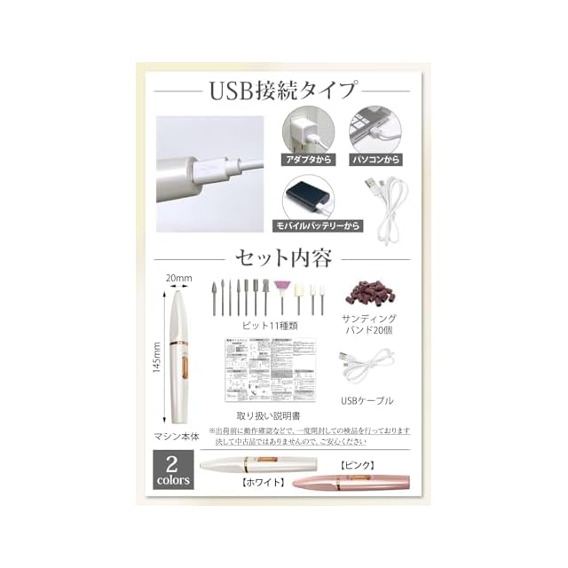 USB充電式で11種類のビットを付属しております。あれこれそろえることなくセルフネイルを始めれます!初心者さんには嬉しいセットとなっております。