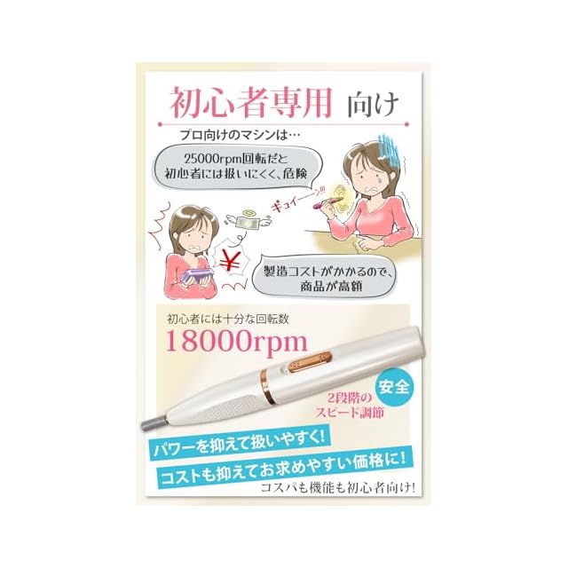回転数を18000rpmに抑え、2段階のスピード調節機能でより安全に扱いやすく設計しております。コスパも機能も初心者向けに作っております。