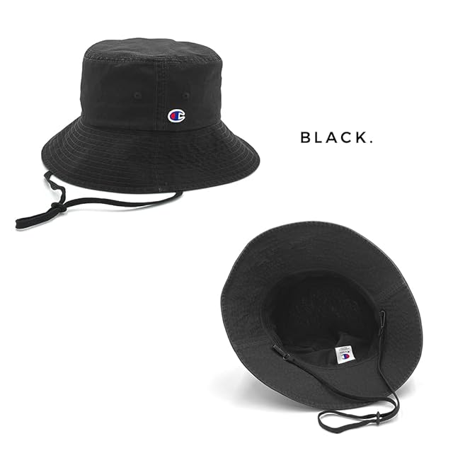 [チャンピオン] 帽子 紐付き レディース バケットハット 深め ツバ長 メンズ あご紐 コード バケハ おしゃれ ブランド 無地 UVカット 紫外線 日よけ 日除け 小顔効果 洗える アウトドア ゴルフ (ブラック)