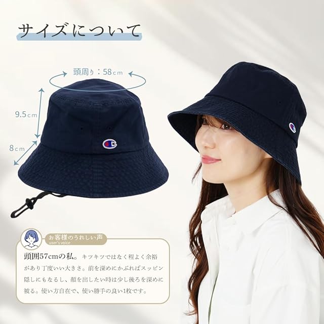 商品名:[チャンピオン] 帽子 紐付き レディース バケットハット 深め ツバ長 メンズ あご紐 コード バケハ おしゃれ ブランド 無地 UVカット 紫外線 日よけ 日除け 小顔効果 洗える アウトドア ゴルフ (ブラック)