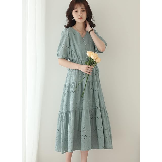 ●Vネックデザインで全体的な甘めを控えて、魅力な鎖骨が現れて、大人可愛いイメージが作れます。ゆるさある半袖のパフスリーブで、トレンドライクにしていて、おしゃれ度UPされました。身頃はウエスト切り替え位置を少し高めに設定しているので脚長効果もあり、気になるお腹やふとももをカバーしてくれて、一番細い部分だけを引き締めて、着痩せ効果が抜群になります。刺繍加工も入ったので、通気性が優れて、夏でも快適に過ごせるワンピースです。フロントのくるみ釦が並んでて、スタイルがワンランク上になります。