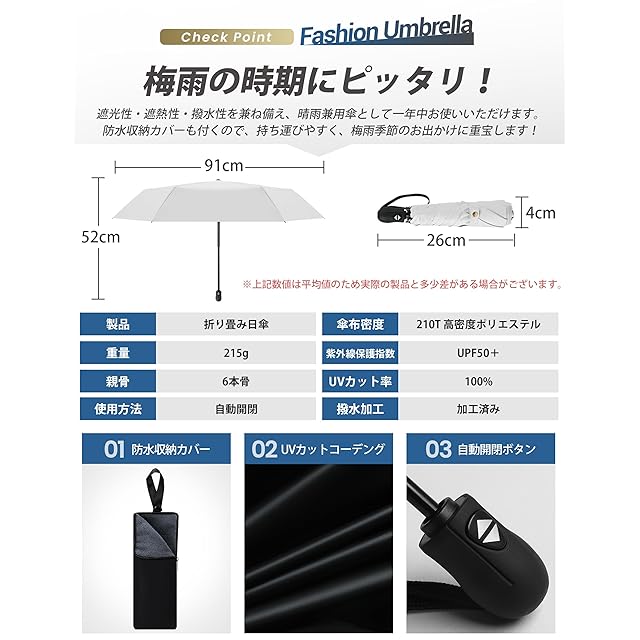 【商品仕様】●【重量】215g。●【サイズ】開いた時:直径91cmx高さ52cm、折り畳んだ時:長さ26cm×直径4cm。●【付属品】防水折畳傘ケース。