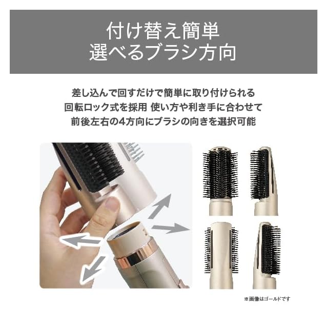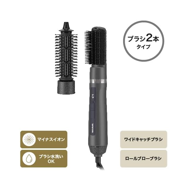 幅広のワイドキャッチブラシと、ピンと植毛が360度に配されたロールブローブラシが付属。ブラシを使い分けることで、ボリュームアップさせたヘアスタイルや、クセを伸ばし髪を整えるブローのニーズに応えます。