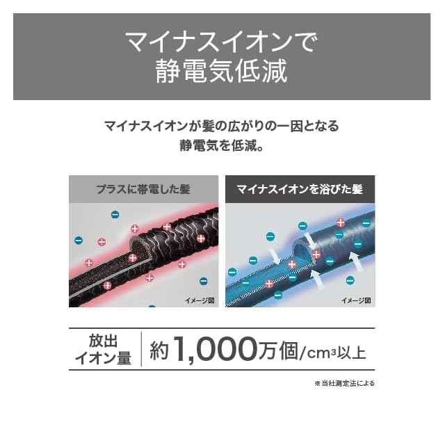 ブラッシングしながらマイナスイオン※が髪全体に行き届き、髪の広がりの一因となる静電気を低減します。※放出イオン量 約1,000万個/cm3以上 / 当社測定法/当社比較検証法による