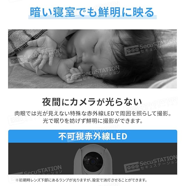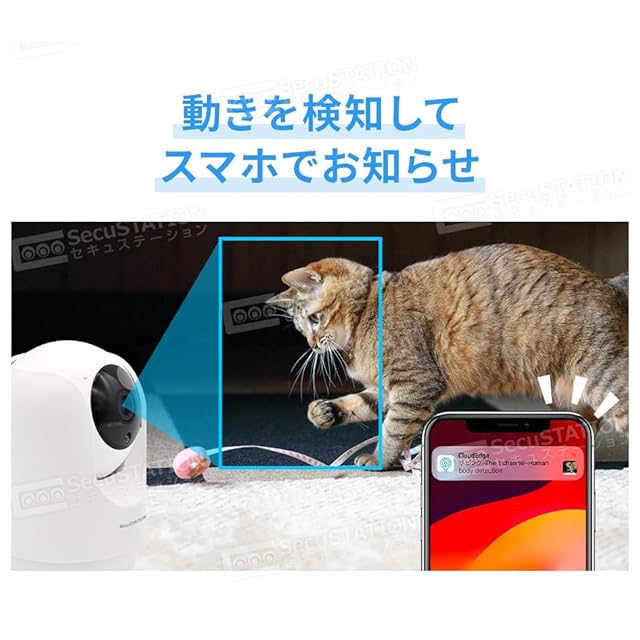 SecuSTATIONが販売する見守りカメラです。ペットやお子様、ご高齢者の方の見守りとしてお使いいただけます。万が一の為の防犯対策としても。スマホにすぐ動画保存が出来る為、SNS投稿などにおすすめです。 ※インターネットを使用せずに使用する場合も、初期設定時にはWi-Fi環境が必要です。 また、インターネットを使用せずにカメラを使用する場合は、遠隔地からの監視や操作、クラウド録画など インターネット環境を必要とする機能はご利用いただけません。