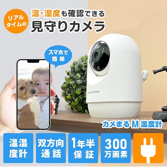 商品名:SecuSTATION カメまるM温度計 屋内 ペット 見守りカメラ 温度センサー付き 300万画素 双方向音声 ベビーモニター 防犯 ワイヤレス 自動追跡 動作検知 スマホ Alexa対応 防犯設備士推薦 国内メーカー SC-MQ53A