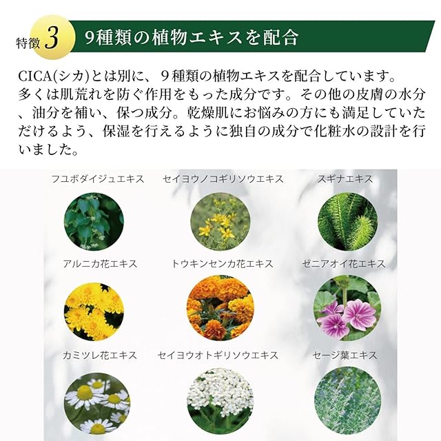【乾燥肌にも。9種類の植物エキスを配合】Cica(シカ)にプラスして9種類の植物エキスを配合しています。多くは肌荒れを防ぐ作用をもった成分で「保湿」をおこなえるように独自設計で配合しています。