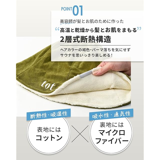 商品名:[tot/now] 公式 サウナハット タオル トットノウ 美容師が作った髪とお肌をまもるサウナハット メンズ レディース【2層式断熱構造】 髪のダメージケア 呼吸しやすい 蒸れない 大きめ 深くかぶれる 簡単洗濯 (グリーン×アイボリー)