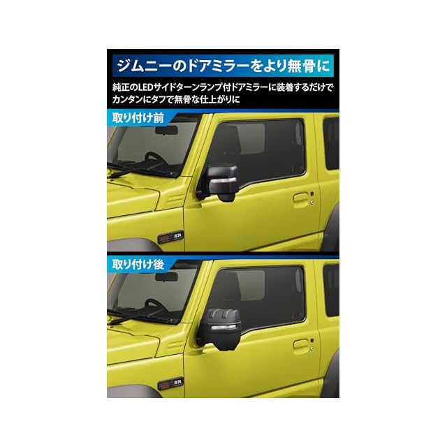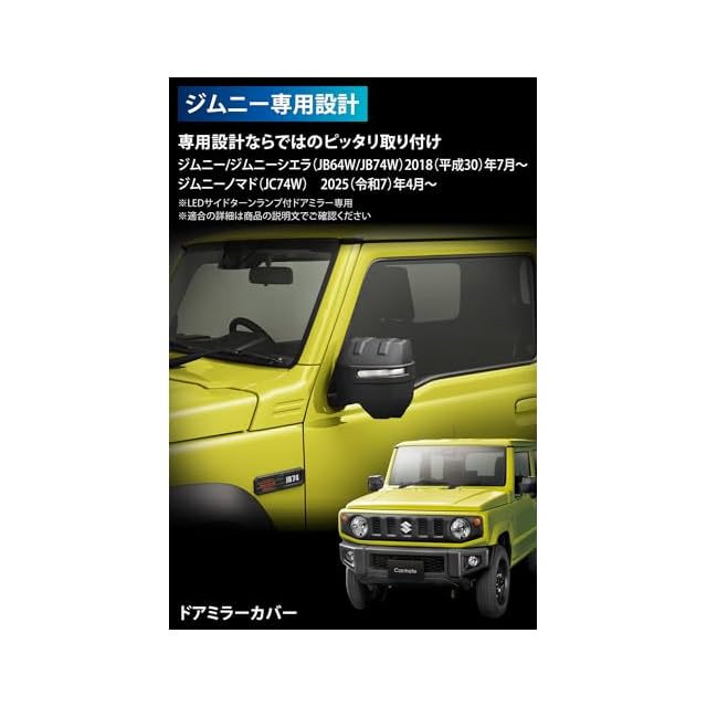 【スズキ ジムニー (JB64)ジムニーシエラ(JB74)ジムニーノマド(JC74)専用開発のドアミラーカバー】 ジムニー(型式:JB64 年式:2018[平成30]年7月~)、ジムニーシエラ(型式:JB74 年式:2018[平成30]年7月~)、ジムニーノマド(型式:JC74W 年式:2025[令和7]年4月~)の LEDサイドターンランプ付きドアミラー専用に設計・デザインしたドレスアップパーツです。