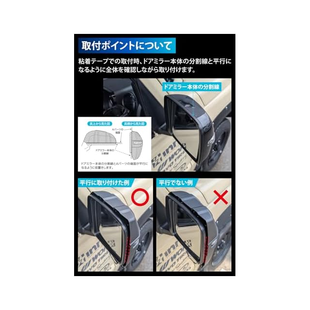 【風切り音を考慮した静音設計】 高速道路の120km/h制限区間の走行テストでも大きな風切り音がしないことを確認しています。 【洗車機も可能な強力取り付け】 本製品は強力な外装用粘着テープとパーツ同士の強力な組み合わせ、ネジ2か所による強固な取り付けを採用しています。 また、装着したまま自動洗車機を利用しても製品に不具合がないことを確認しています。