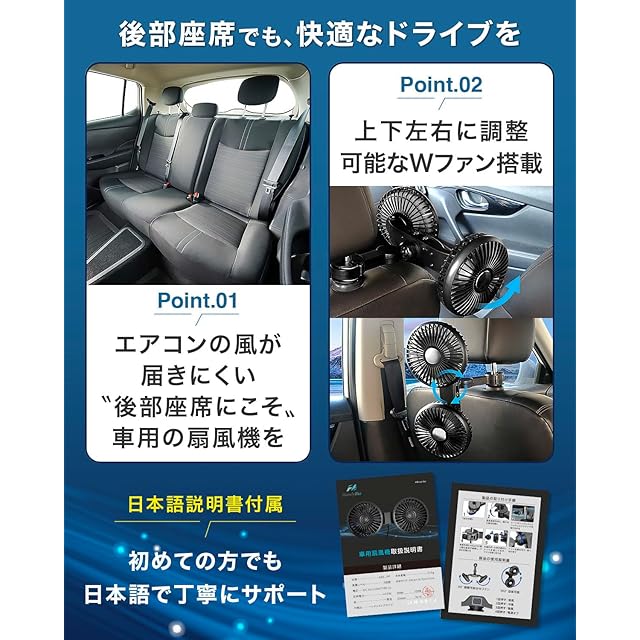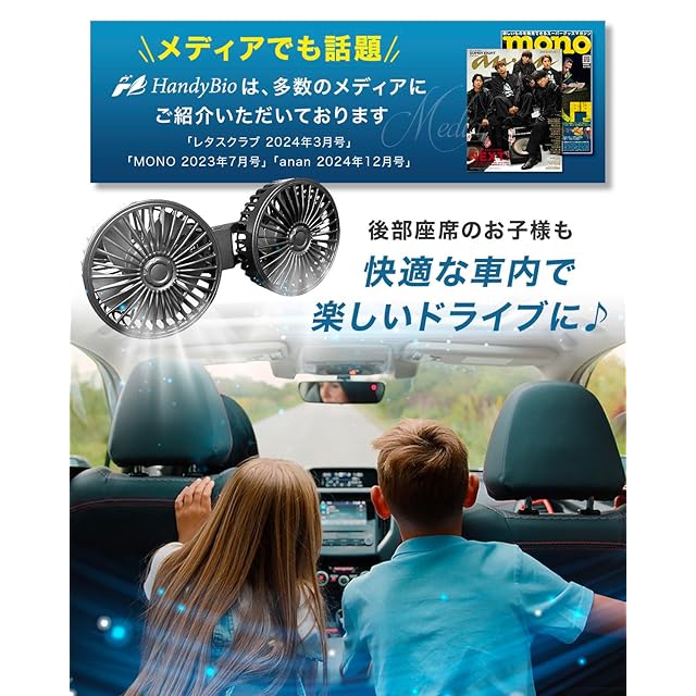【デュアルファン搭載】2つのファンが装備されており、車内の空気を効率的に循環させます。二人でも同時に使用可能
