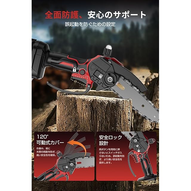 【軽量化と安全性を両立】 本小型チェーンソーは軽量と安全保護を一体化し、超軽量技術設計を採用し、本体の重量はわずか854gで、手首や腕の負担を大幅に軽減し、長時間の作業でもリラックスして快適に保つことができます。 小型でコンパクトな機体は、高所や狭所など様々な作業ニーズに幅広く対応し、高精度かつ効率的な作業を実現します。 一方、ユーザーの安全を確保するために、二重ボタンの安全ロックシステムを装備し、効果的に誤作動を防止します。 また、本電動チェーンソーには木屑の飛散を防ぐ可動式プレートカバーが装備され、目と手を保護するゴーグルと保護手袋も付属しているため、効率的なソーイングを楽しめるだけでなく、安心感も得られます。