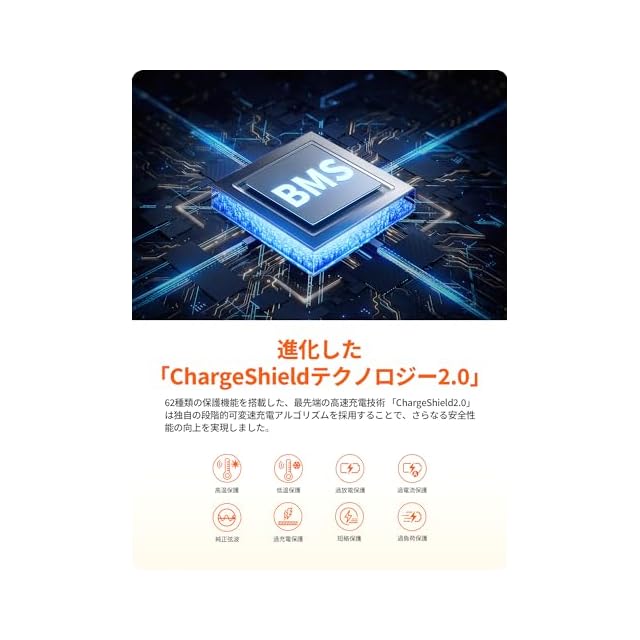 【進化したChargeShield2.0】62種類の保護機能を搭載した、先端の高速充電技術 「ChargeShieldテクノロジー2.0」 は、独自の段階的可変速充電アルゴリズムを採用することで、さらなる安 全性能の向上を実現しました。