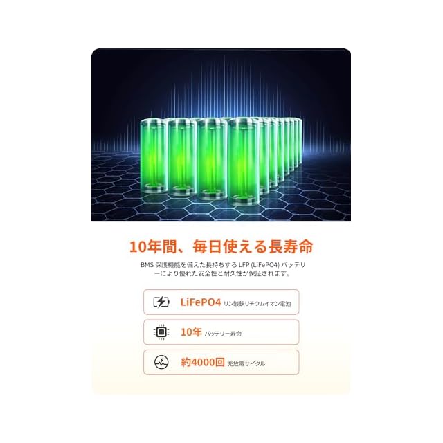 【10年使える長寿命】毎日充電しても10年間長持ちする高耐久リン酸鉄リチウムイオン電池、4,000回の充電サイクル後もバッテリー残量は70%を維持します。