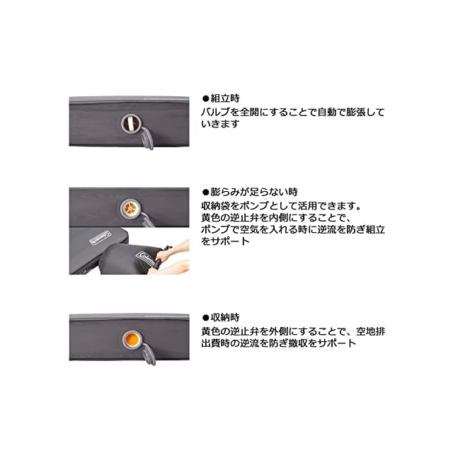 【収納】収納時は、黄色の逆流弁を外側にすることで、空気排出時に逆流を防ぎしっかりたたむことができます。