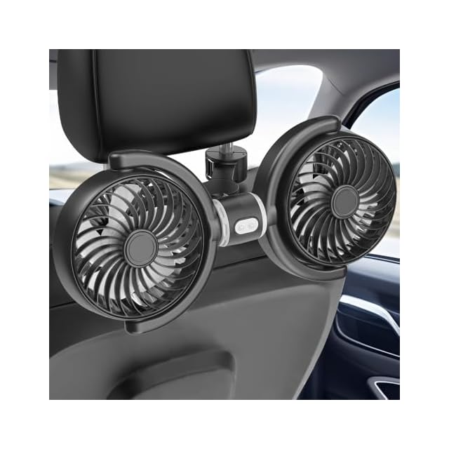 商品名:車用扇風機 【2025夏初デビュー USB給電】車載扇風機 後部座席用 双頭車載ファン 独立制御 3段階風量 360°角度調整可能 低騒音 ヘッドレストファン 後部座席に送風 車用ファン 空気循環 取付簡単 夏対策 熱中症対策 取付簡単 日本語説明書付き