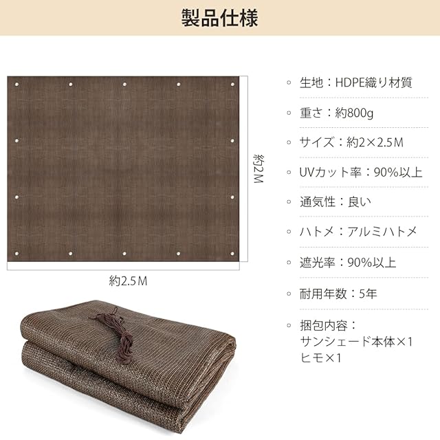【取り付け簡単】日よけシェードは錆びないハトメであり、付属したヒモが必要な長さにカットして、日本語説明書の通りに簡単、安全、自由自在に日よけシェードスクリーンをお取付けます。uvカットサンシェードは中性洗剤と水で洗って、簡単に汚れが落ちせ、カビや色褪せを防ぎ、長くお使いになれます。日よけ止めシェードも折り畳んでコンパクトに収納できます。