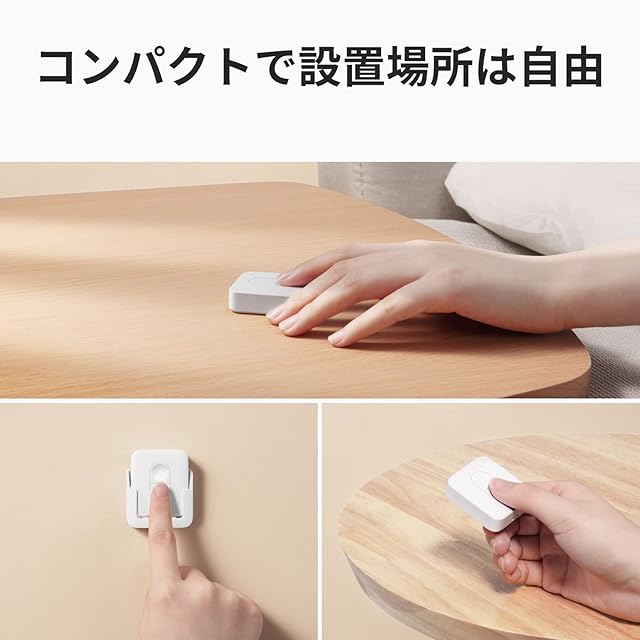 【コンパクトで好きな場所に置く】手のひらに収めるコンパクトな外観。ベッドサイドテーブルや机など、手の届くところに設置すれば、快適にご使用いただけます。取付台が付属、3M両面テープで壁に設置することも可能。