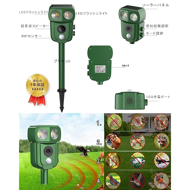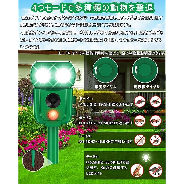 【超音波&LEDライトで動物を撃退】この害獣撃退器は広範囲超音波とLEDフラッシュ組み合わせた総合4つのモードがあります、周波数は13kHz〜45kHzの広い範囲、動物が検知範囲に入ると、撃退器は自動的に超音波を発するか、強い閃光を発して動物を追い払います。LEDライトを搭載、超音波の特定の周波数に適応してしまい受けにくくなる有害動物も、強力なLED点滅ライトとで効果的に追い払います。また、感度調整のダイヤルもあり、場合によって調整できます。超音波センサーのため、少し音が聞こえます。人と動物に無害ですが、室外に置いた方をおすすめいたします。