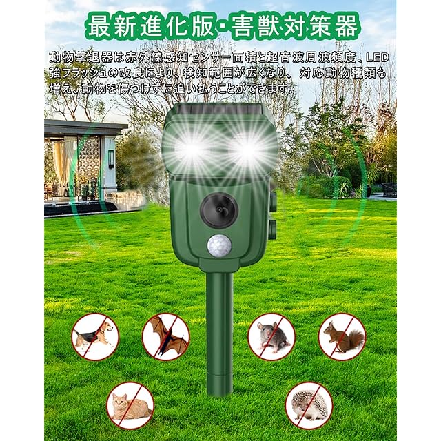 【2025最新増強版&害獣対策器】最新高機能版の動物撃退器、赤外線自動感知で害獣などを感知。感知すると超音波スピーカーで、動物が嫌がる超音波を発生。動物は機械に慣れるという特性がありますが、当製品は揺らぎのある超音波で、厄介な動物慣れを防ぎます。改良版の動物撃退器は赤外線感知センサー面積と超音波周波頻度、LED強フラッシュの改良により、検知範囲が広くなり、対応動物種類も増え、退治効果も増強できました。動物愛護の観点から作られた撃退器です。動物を傷つけずに追い払うことができます。