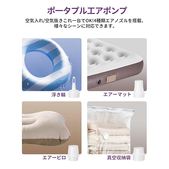 【4WAYノズルで全ての空気作業を解決】エアーマットから浮き輪まで、4種類の専用ノズルで多彩なシーンに対応します。簡単に装着可能なコンパクト設計で、収納袋付きだからアウトドアでも家庭でもすぐに活躍します。電動ポンプ一台で全ての空気入れ替えが簡単にできる優れものです。