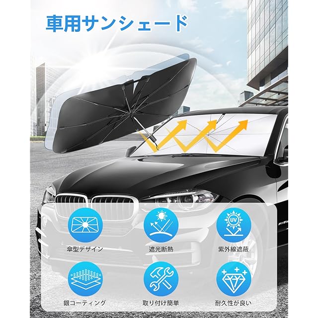 サンシェード 車 フロント 傘型 折り畳み式 遮熱 遮光 UVカット 紫外線遮蔽 車中泊 仮眠 車用パラソル 取付簡単