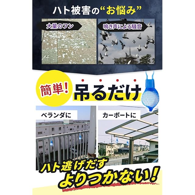 【吊るだけ簡単・設置に便利なプールロック付】ベランダ・軒下・ガレージに吊るすだけ。誰でも・簡単に・すぐ設置できます。固形なので、雨風にも強く効果・持続性がケタ違い。テープなどを貼る必要もなく、手すり・床がベタベタ汚れません。設置時に便利なプールロックが4本付いています。